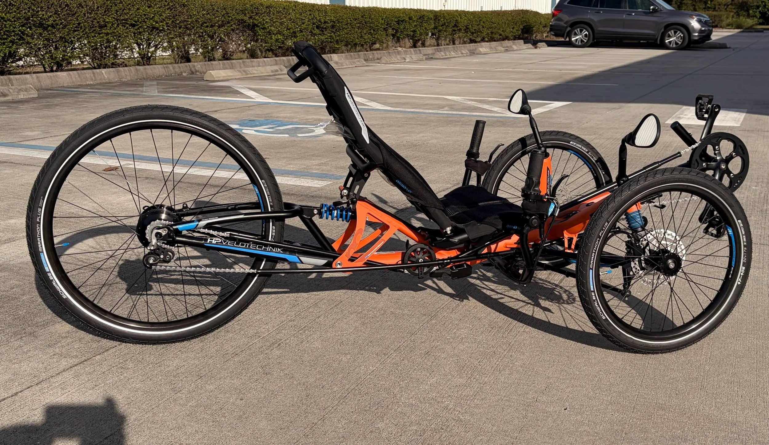 HP Velotechnik’s awesome entry-level folding trike. 24-speeds and hydraulic brakes. Available in RED OR BLUE!